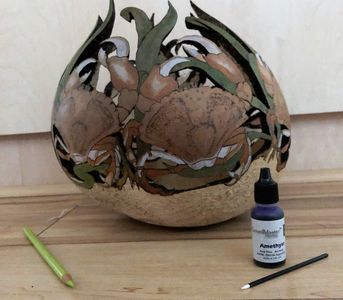 Color is added to the design using oil pastel pencils or dyes made specifically for gourds